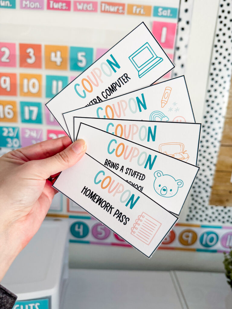Would you like a set of coupons that you can hand out to students to reward positive behavior? I created 30 editable coupons all with FREE ideas so you don’t have to spend money when students earn a reward 🥳