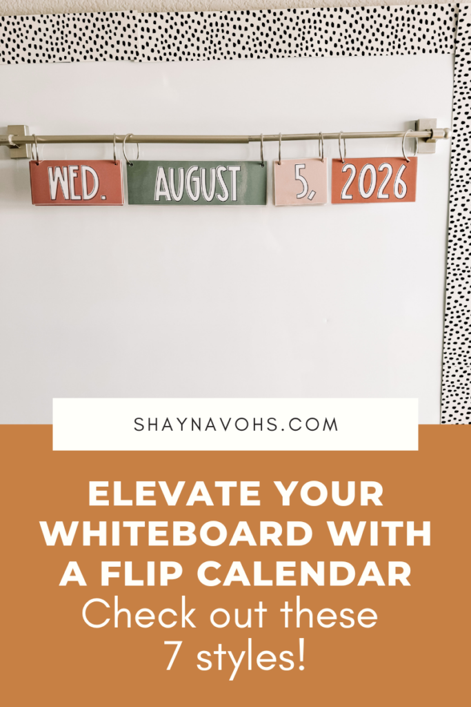 The Modern Calm Colors classroom flip calendar is a classic for good reason! Hang it on a magnetic curtain rod, or simply on your whiteboard with magnetic tape like @craftingintheclassroom did. 🙂