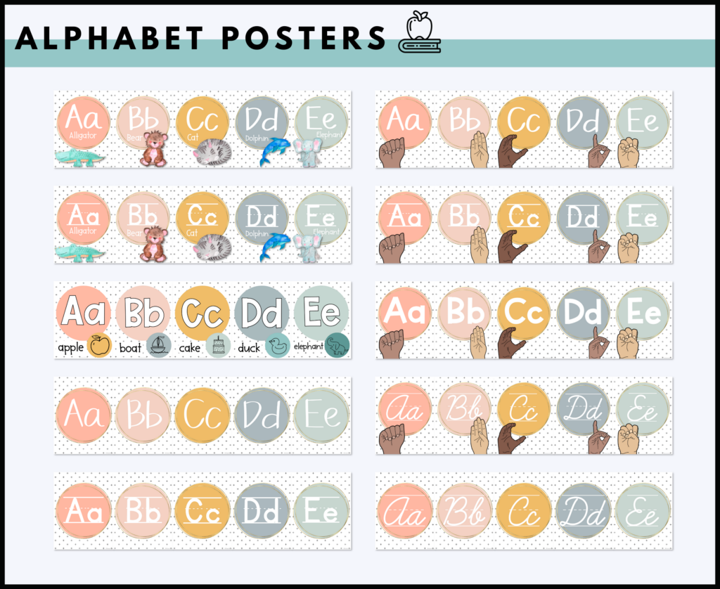 This bundle includes so many different ways to display the alphabet for your young learners! Here are the different designs that are included:
